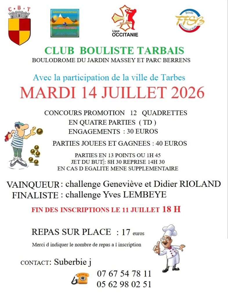 Accueil CONCOURS Club Bouliste Tarbais Concours Promotion Quadrettes Mardi 14 Juillet 2026 Publié 10 janvier 2026
