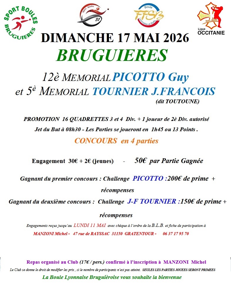 Accueil CONCOURS Bruguieres Challenge G.Picotto & Mémorial J.F Tournier 17 mai 2026 Publié 4 mars 2026