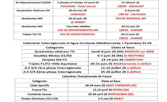 Calendrier Départemental 31 Régional zone Pyr & Méd-2026